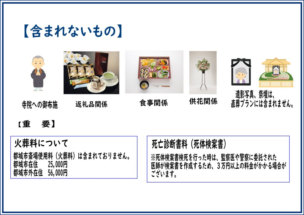 最後に、一般的な葬儀でご用意される返礼品や食事等はふくまれていませんので、ご注意ください。