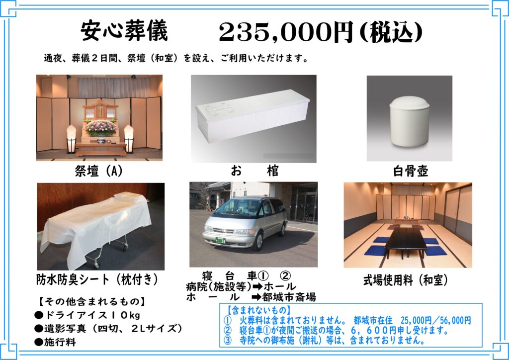 弊社では、直葬プランの他に、別プランとして 「安心葬儀 235,000円(税込)」をご用意いたしております。