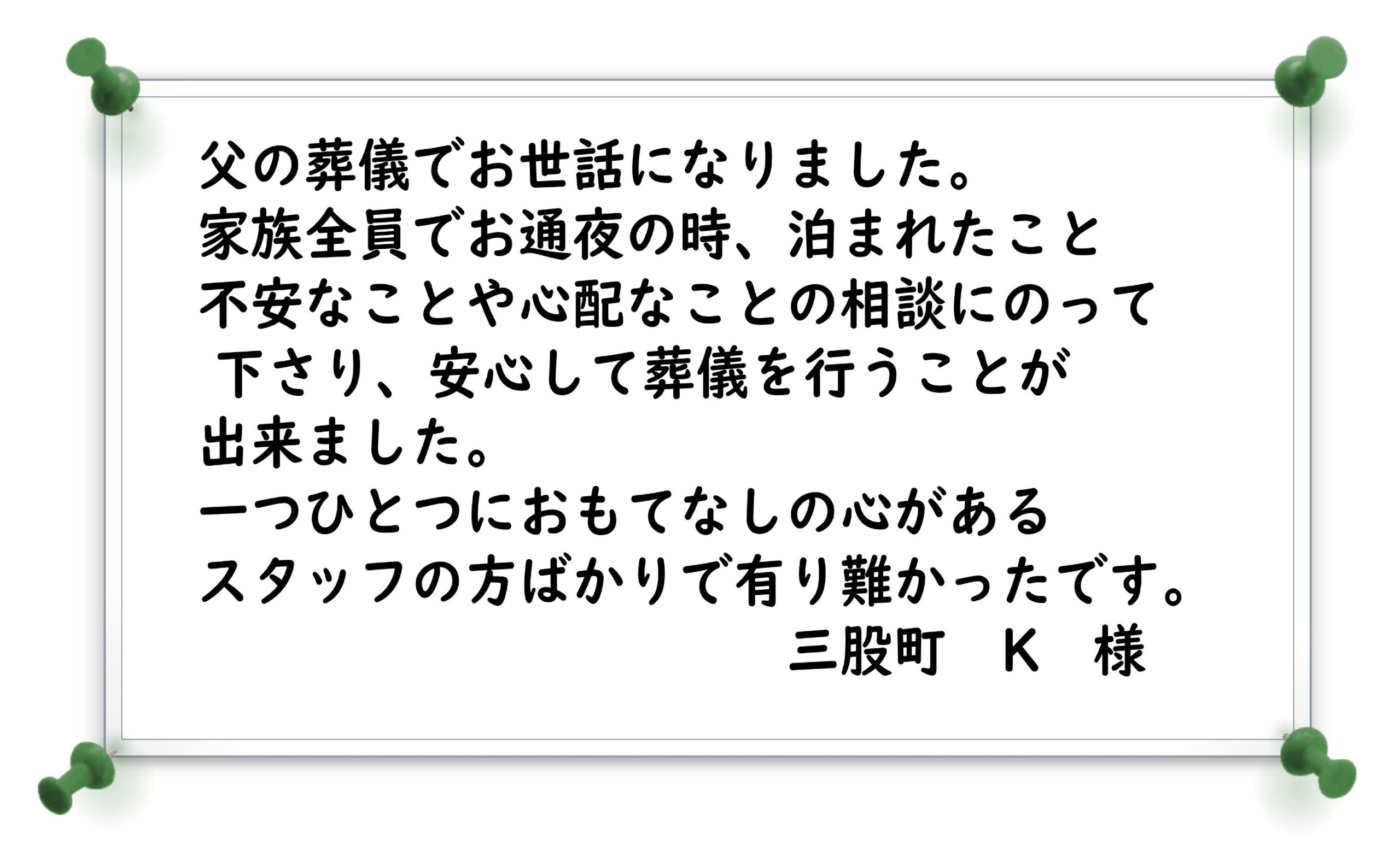 このような有難いコメントをいただけるよう、そして何より葬儀を滞りなく、ご家族に寄り添ったお手伝いをできるよう心掛けて参ります。