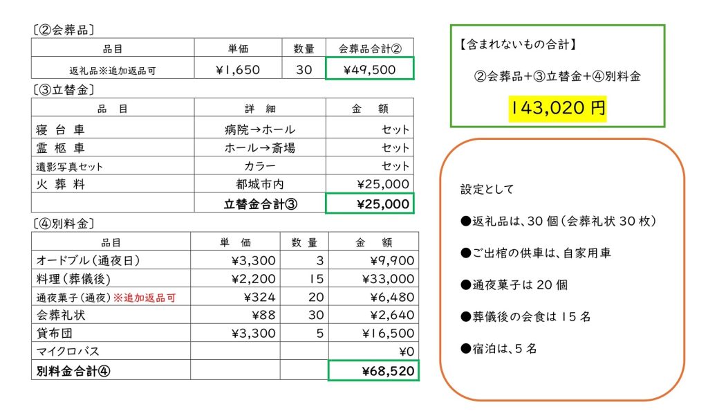 弊社では、人数によって変動する科目はプランに入っていません。ただ、この費用も葬儀費用では大きな割合をしめますので、ご説明いたします。プランに含まれないもの、主に下記のような内容です。