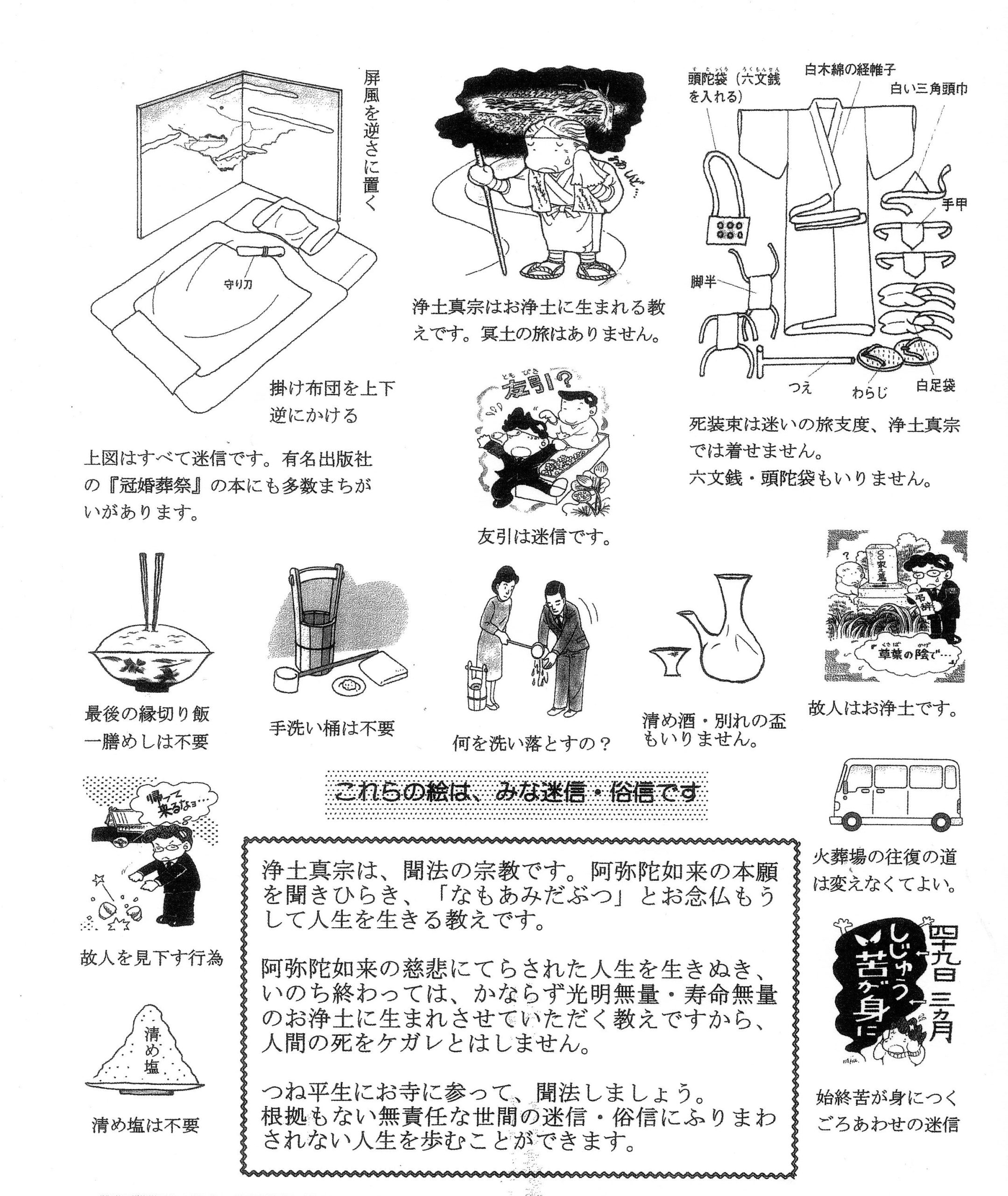 葬儀社にも、浄土真宗としてのお考えを学ばせていただく機会もございます。昔から言い伝えれれていることと、仏教の教えについて下記のような資料をいただいております。