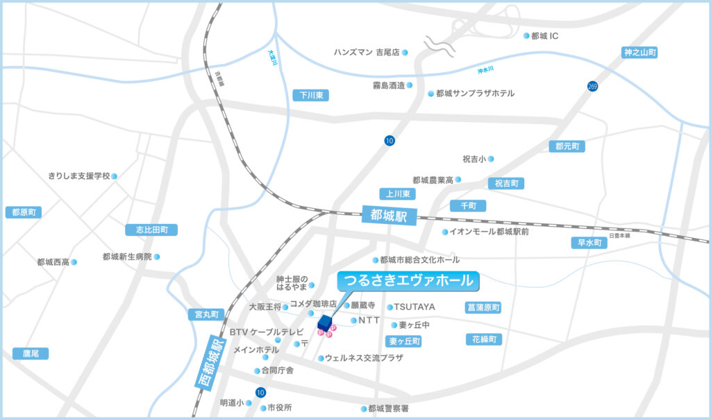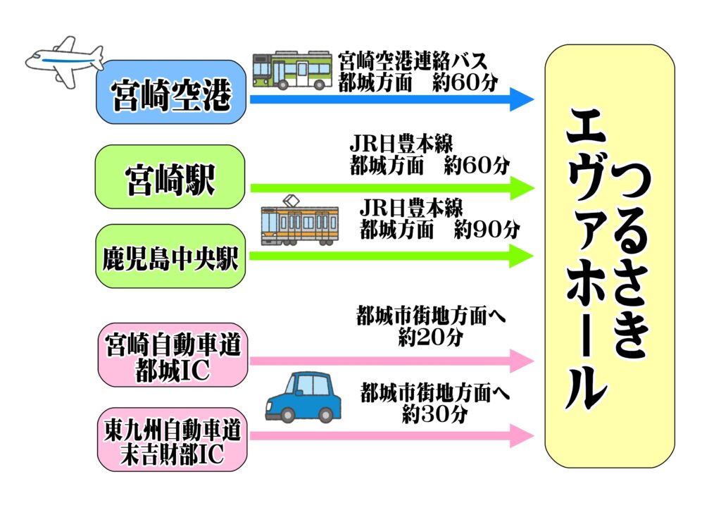 つるさきエヴホールは、都城市の中心市街地に位置しております。ですので、市内外、さらには県内外からのアクセスは、大変よい場所です。飲食店、ホテル等も充実しており、どこからもアクセスし易いと思います。