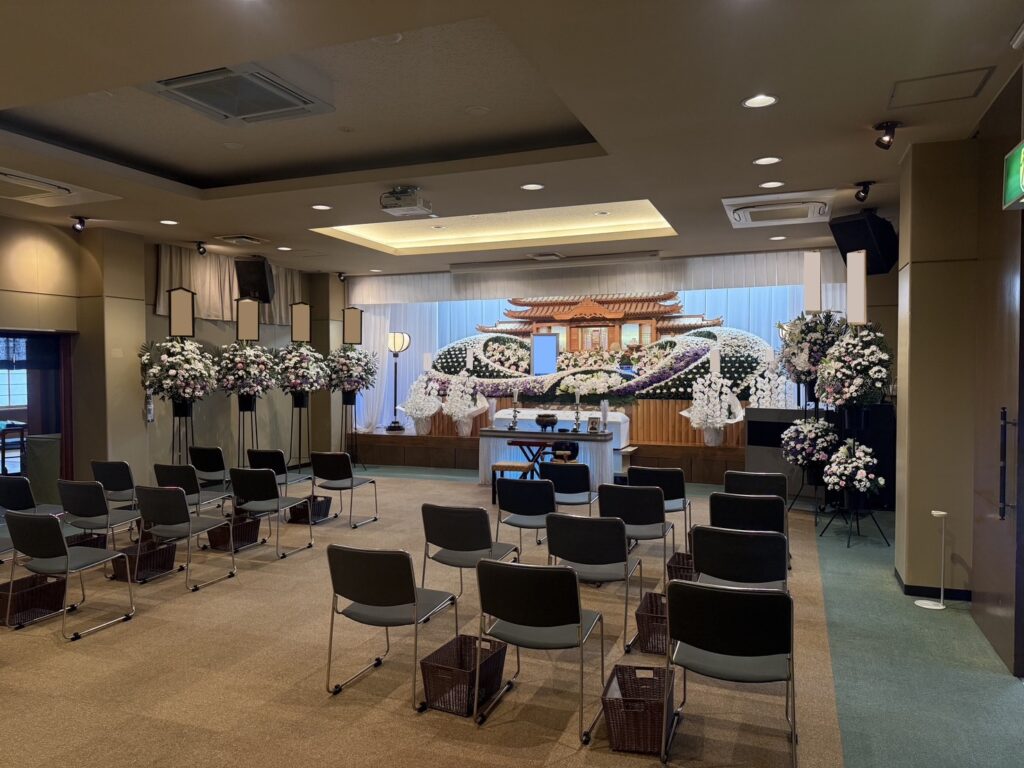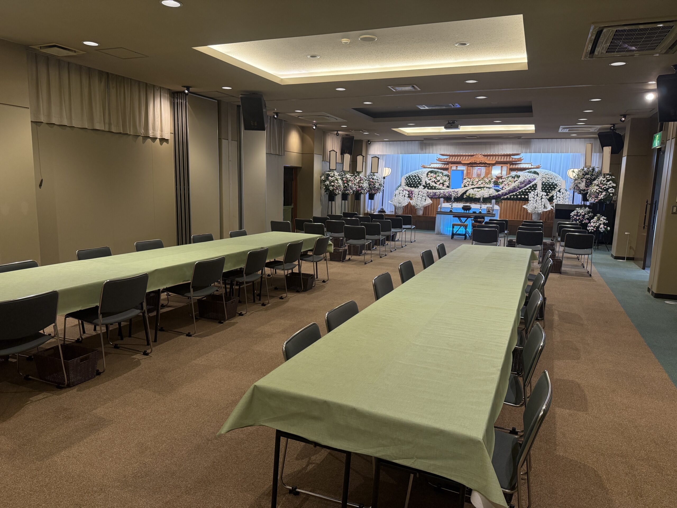 弊社の式場(つるさきエヴァホール)は、家族葬用にレイアウトができます。この写真は、通夜時の様子です。 ※コロナ禍の時はテーブル席は、設えなったのですが、最近ではこのように式場内にテーブル席を設えております。
