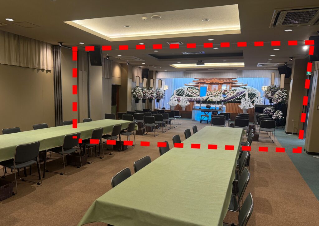 ↓また葬儀日は、この式場を下記の写真のよう赤線の位置で中央で仕切ることもでき、少人数で式を執り行うことも出来ます。