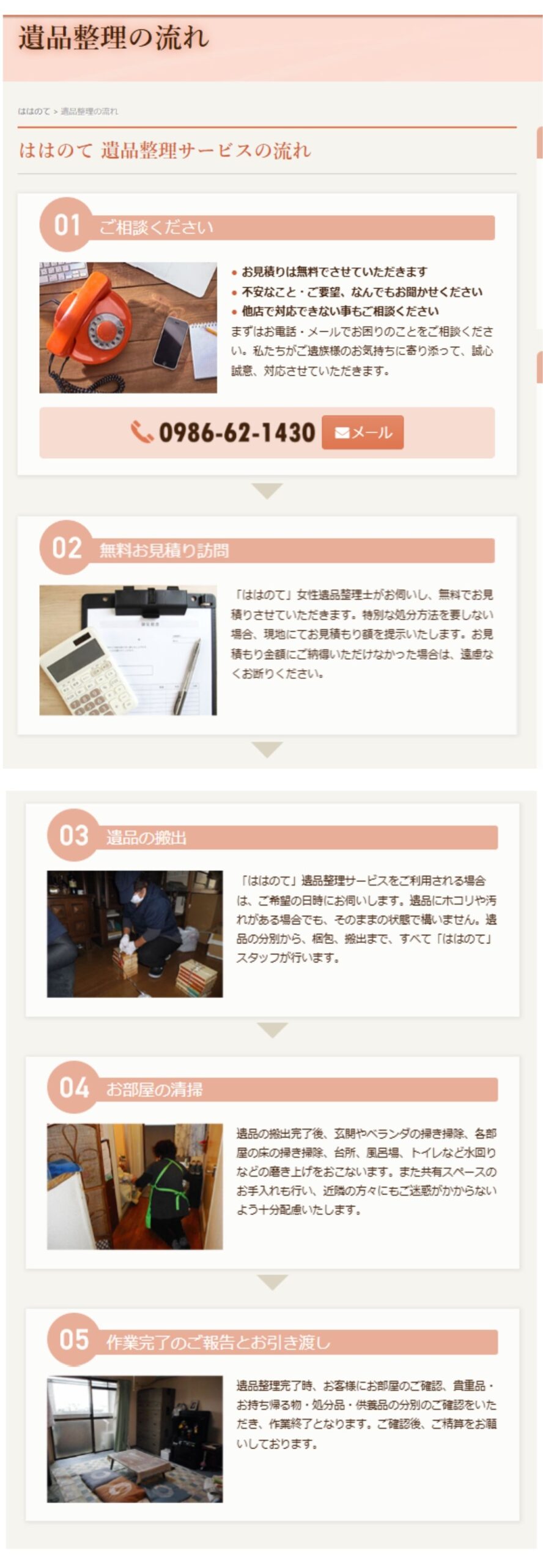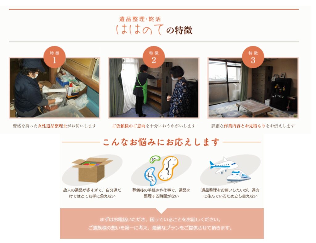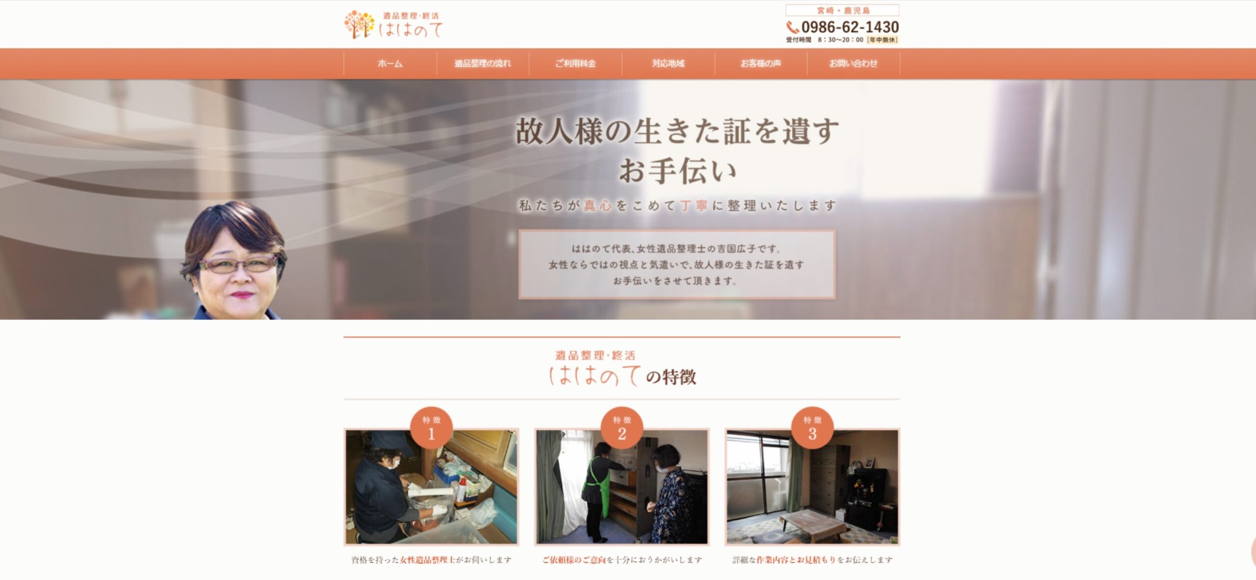 都城市を中心に宮崎県南部地域、及び鹿児島県北東部にかけ広い地域に対応されています。 故人の遺品整理、ご供養代、搬出、処分、庭手入れ、遺品発送(書類など)、室内の掃き掃除、不明品の捜索など、幅広い事業に取り組まれています。